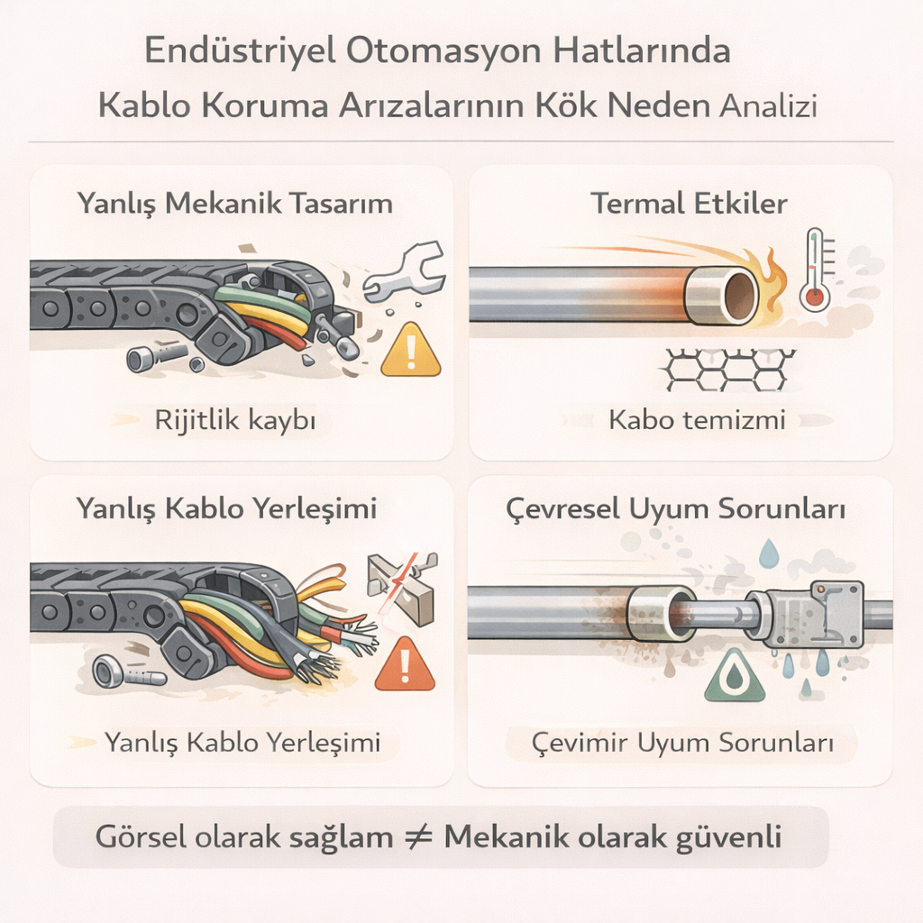 Bu makalede endüstriyel otomasyon hatlarında kablo koruma sistemlerinde görülen arızaların gerçek nedenleri; mekanik, termal, çevresel ve tasarımsal başlıklar altında ele alınacak ve neden–sonuç ilişkileri üzerinden analiz edilecektir.