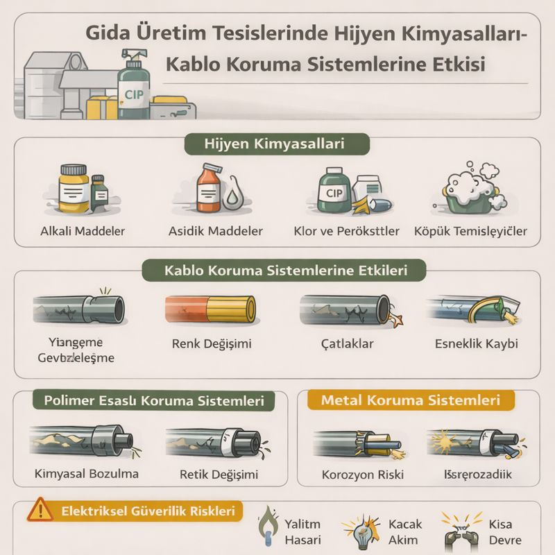 Gıda üretim tesislerinde hijyen kimyasalları vazgeçilmezdir; ancak bu kimyasalların kablo koruma sistemleri üzerindeki etkileri çoğu zaman göz ardı edilir. Sürekli kimyasal maruziyet, koruma sistemlerinde mekanik, kimyasal ve elektriksel zayıflamalara yol açar.