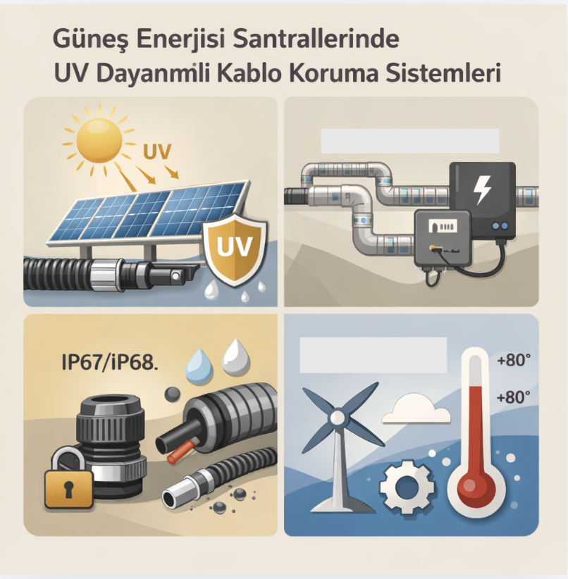 Güneş enerjisi santrallerinde UV dayanımlı kablo koruma sistemleri yalnızca estetik veya teknik bir detay değildir; doğrudan enerji sürekliliğini ve yatırım güvenliğini etkileyen bir unsurdur. Doğru malzeme seçimi, uygun IP seviyesi, termal dayanım ve mekanik performans kriterleri birlikte değerlendirilmelidir. UV stabilizatörlü polimer çözümler ile metal koruma sistemlerinin dengeli kullanımı, uzun ömürlü ve güvenli solar altyapının temelini oluşturur.