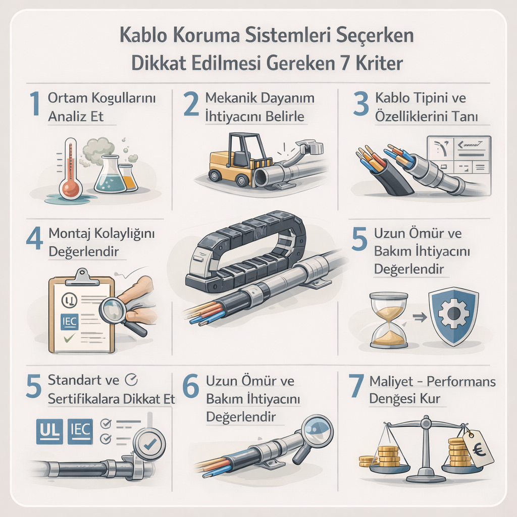 Kablo koruma sistemleri seçimi, teknik bir karar olduğu kadar stratejik bir karardır. Yukarıdaki 7 kriteri dikkate alarak yapılan seçimler, yalnızca bugünü değil, gelecekteki performansı da belirler.