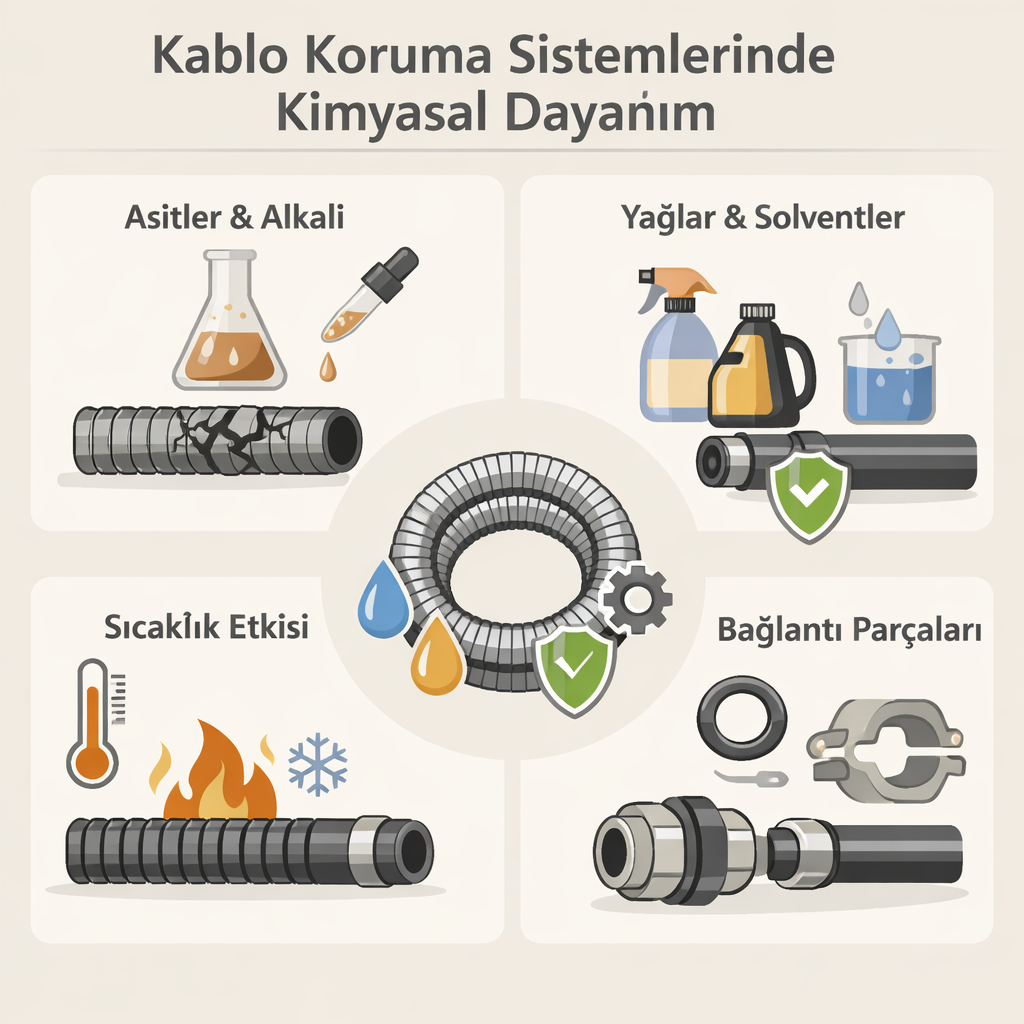 Endüstriyel tesislerde kullanılan kablo koruma sistemleri yalnızca mekanik darbeye karşı değil, aynı zamanda kimyasal etkilere karşı da dayanıklı olmalıdır. Çünkü birçok üretim ortamında kablolar; yağlar, solventler, asitler, alkaliler, temizlik kimyasalları ve çeşitli endüstriyel gazlarla sürekli ya da dönemsel olarak temas eder. Yanlış malzeme seçildiğinde kablo koruma hattında çatlama, sertleşme, renk değişimi, kırılganlık, sızdırma ve uzun vadede elektriksel güvenlik kaybı gibi ciddi sorunlar ortaya çıkabilir. Bu nedenle kablo koruma sistemleri seçilirken kimyasal dayanım konusu, yalnızca ek bir özellik değil, temel bir mühendislik kriteri olarak değerlendirilmelidir.