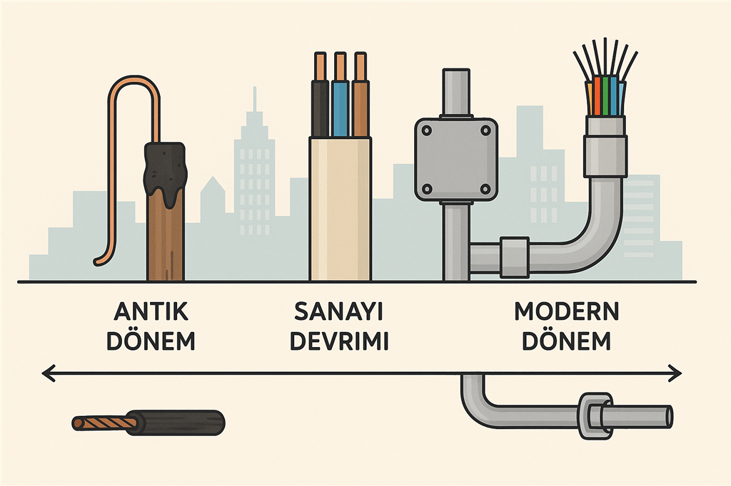 Kablolar, modern yaşamın görünmeyen kahramanlarıdır. Elektrik sistemlerinin omurgasını oluşturan bu iletkenler, tarih boyunca teknolojinin gelişimine paralel olarak evrilmiştir. Bu yazımızda, kablonun tarihsel serüvenini, ilk iletim yöntemlerinden günümüzün sofistike kablo koruma ve taşıma sistemlerine kadar detaylı şekilde inceleyeceğiz. Aynı zamanda elektrik tesisat teknolojileri, EMT borular, kablo tavaları, galvanizli sistemler gibi koruma çözümlerinin bu evrime nasıl katkı sağladığını açıklayacağız.
