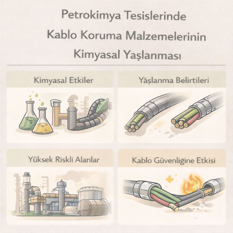 Bu makalede, petrokimya tesislerinde kullanılan kablo koruma malzemelerinin kimyasal yaşlanma mekanizmaları, risk faktörleri, sahadaki belirtileri ve bu süreci yavaşlatmaya yönelik mühendislik yaklaşımları teknik bir çerçevede ele alınacaktır.